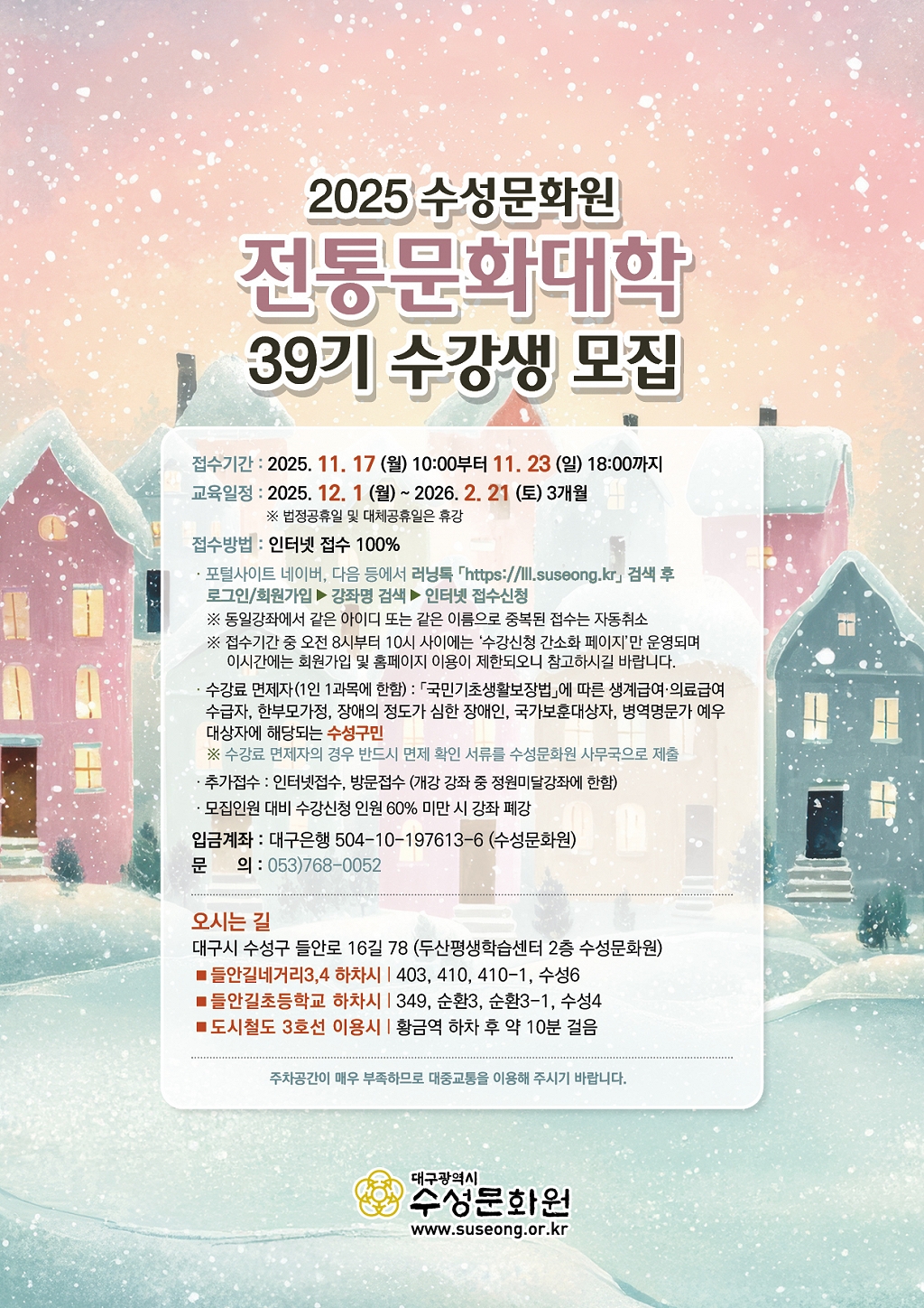수성문화원은 지역민의 꿈과 희망이 함께하고 현대와 전통이 함께 숨쉬는 전통문화예술의 교육 공간으로 주민 여러분과 함께 하겠습니다.